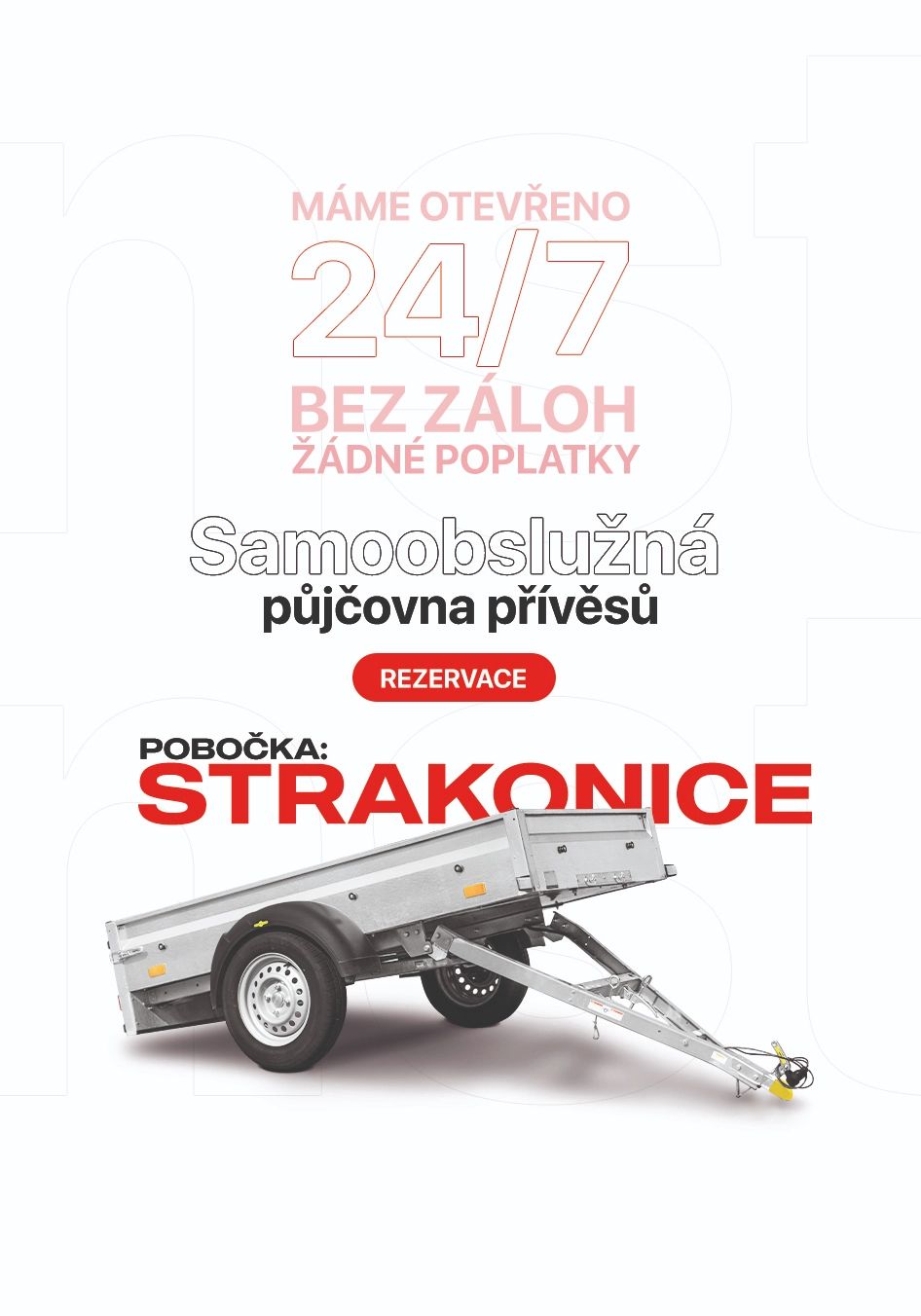 Na žádný kód nemusíte čekat – systém je generuje automaticky a zasílá je v potvrzovacím e-mailu. Díky tomu si můžete přívěs půjčit kdykoli, 24 hodin denně, 7 dní v týdnu.